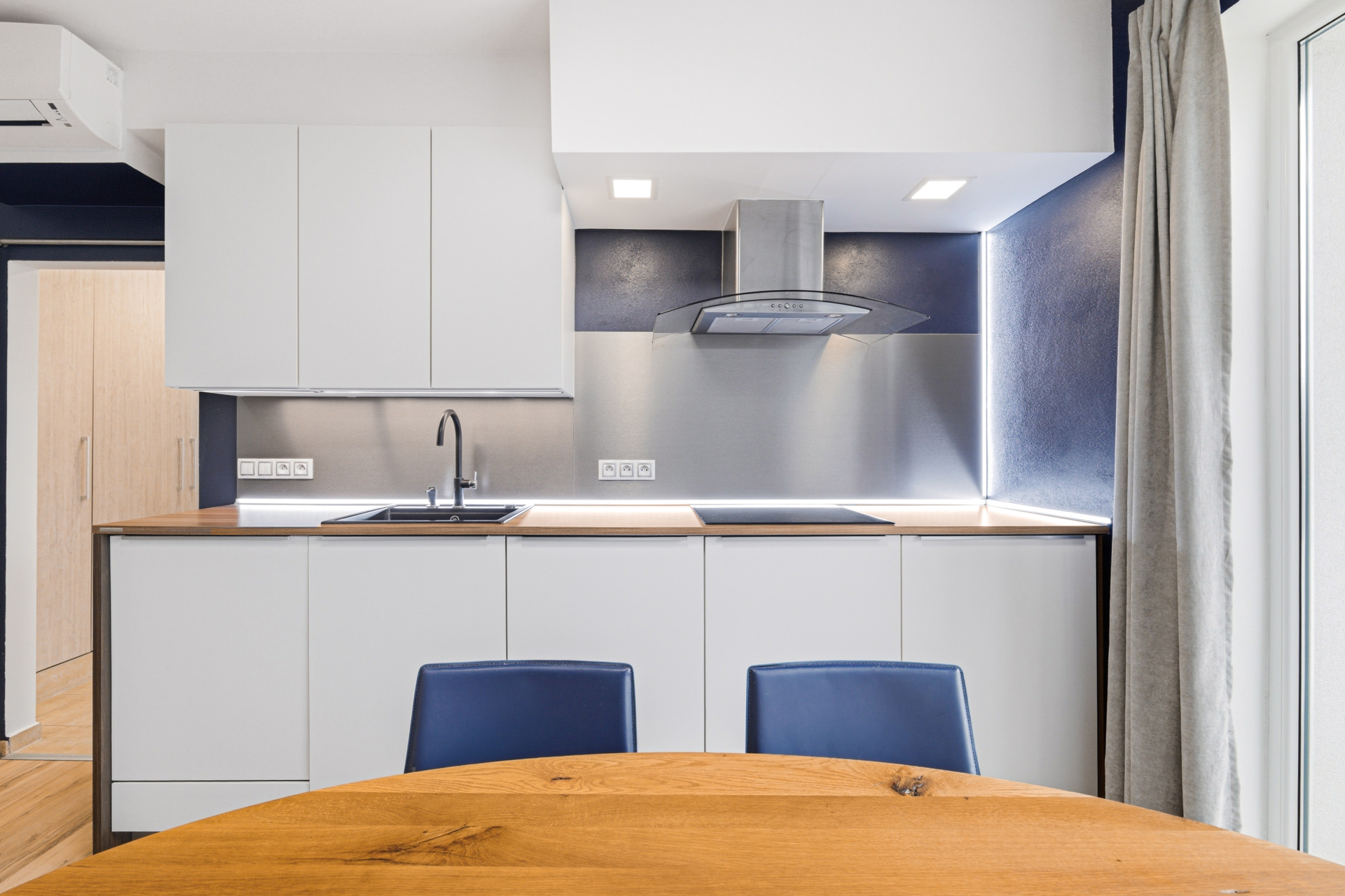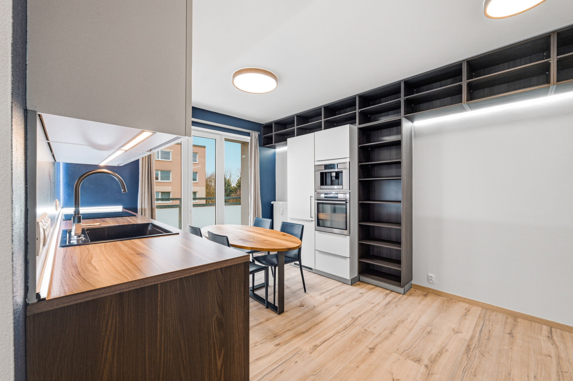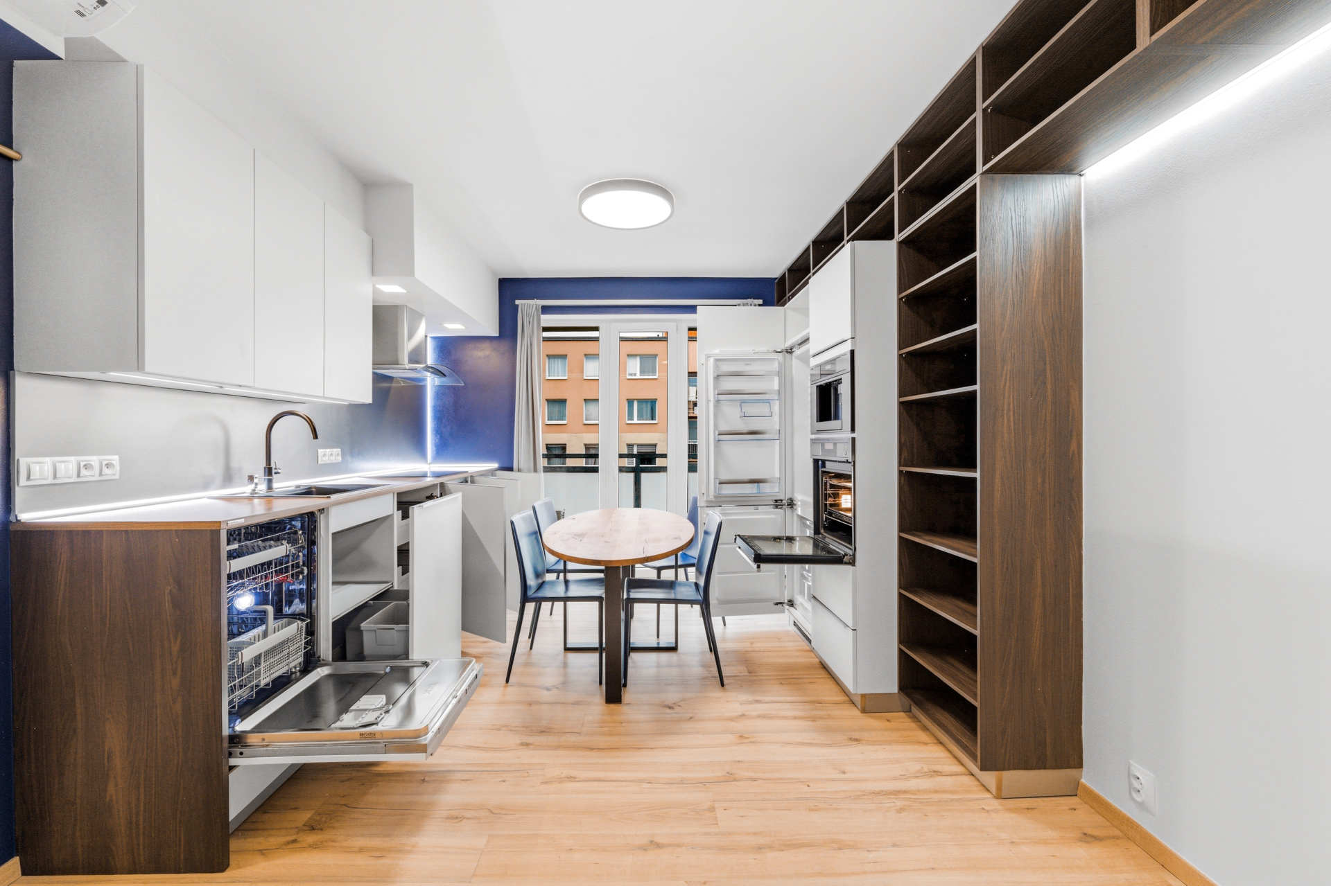 Příjemným centrem bytu je obývací pokoj s kuchyňským koutem, který byl vyroben na míru s důrazem na detail a funkčnost. Kuchyňská linka je plně vybavena vestavěnými spotřebiči včetně kávovaru. V obývacím pokoji je navíc instalována klimatizace, která zajišťuje příjemné klima i v letních měsících.