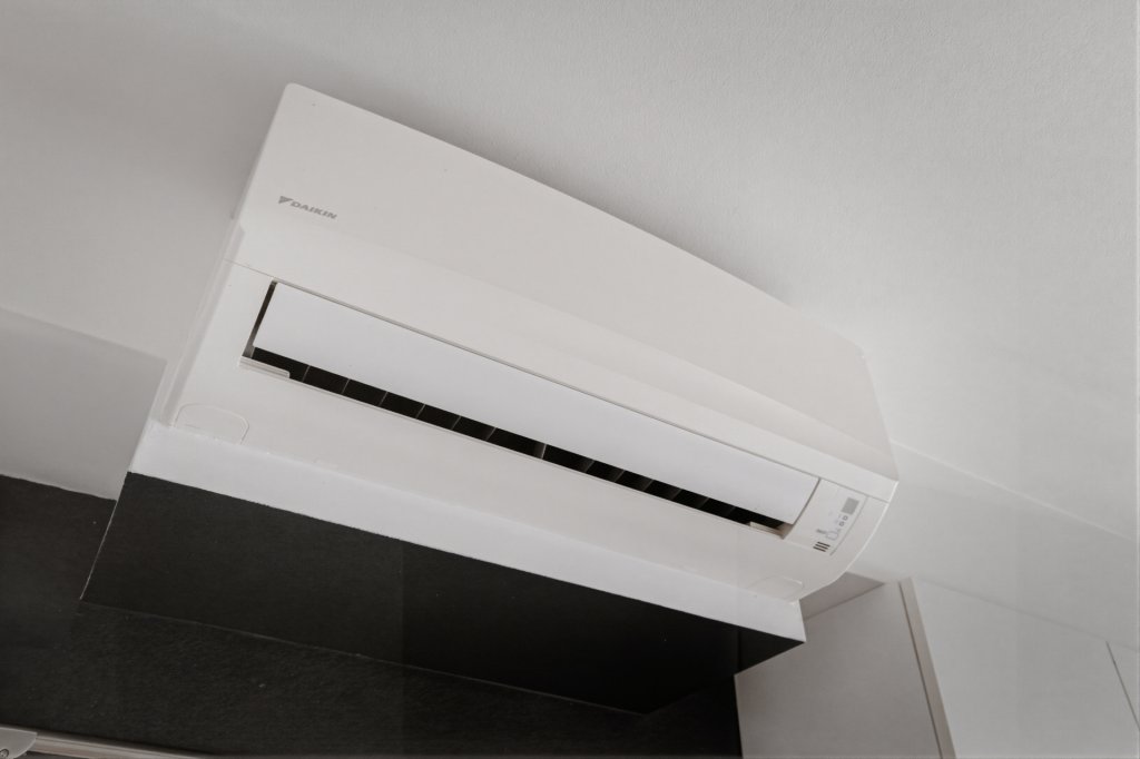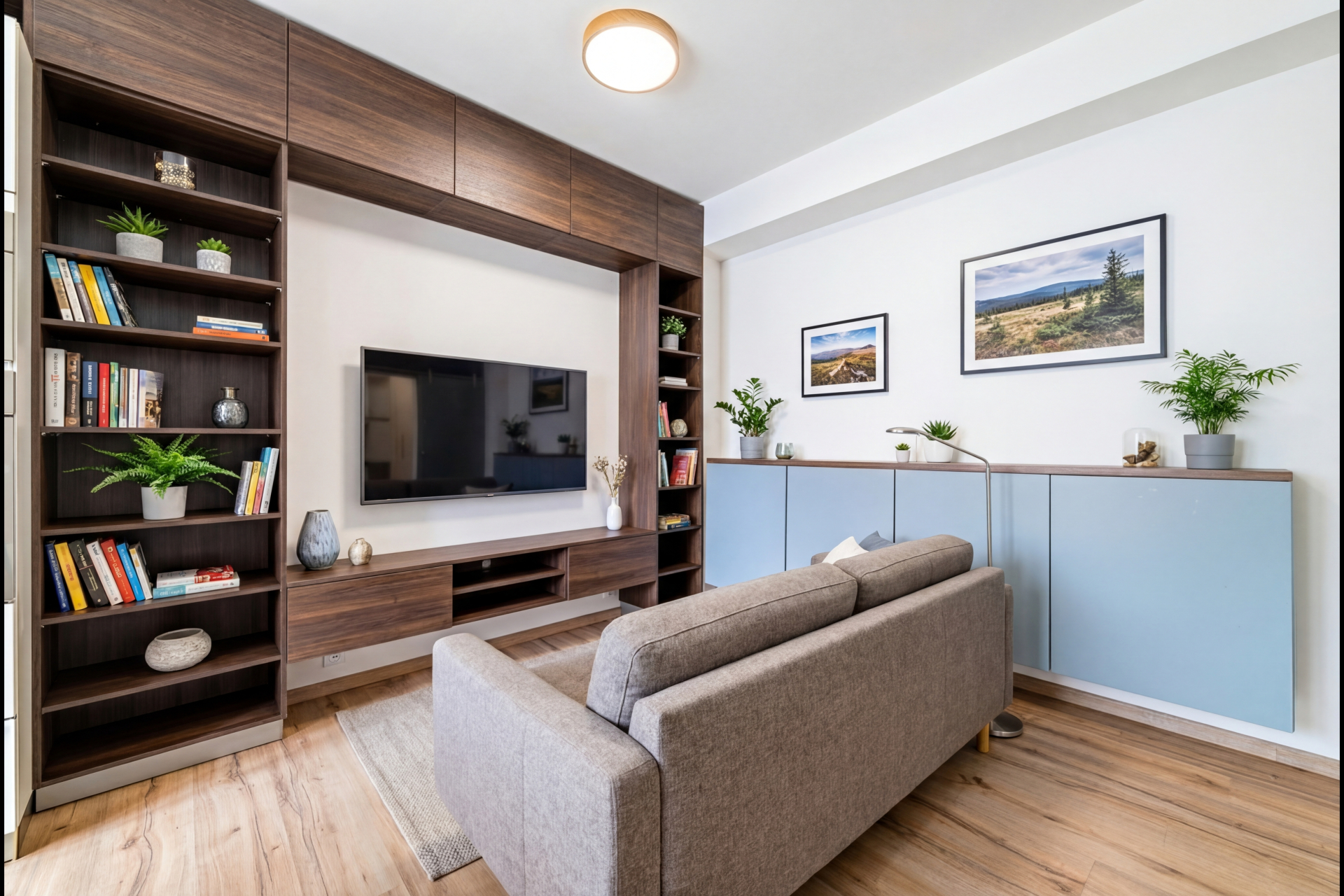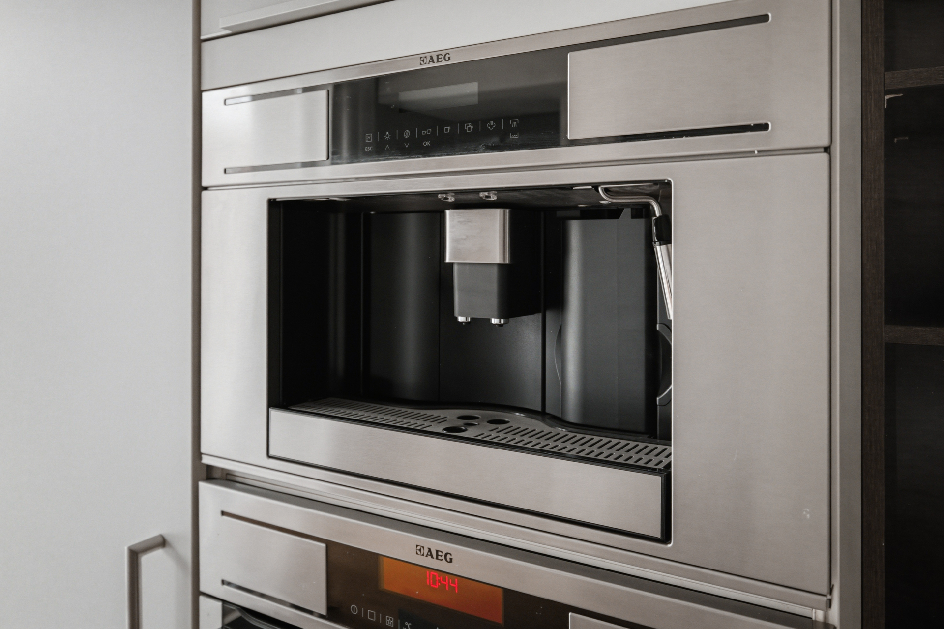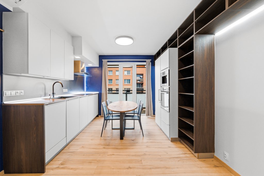 Příjemným centrem bytu je obývací pokoj s kuchyňským koutem, který byl vyroben na míru s důrazem na detail a funkčnost. Kuchyňská linka je plně vybavena vestavěnými spotřebiči včetně kávovaru. V obývacím pokoji je navíc instalována klimatizace, která zajišťuje příjemné klima i v letních měsících.
