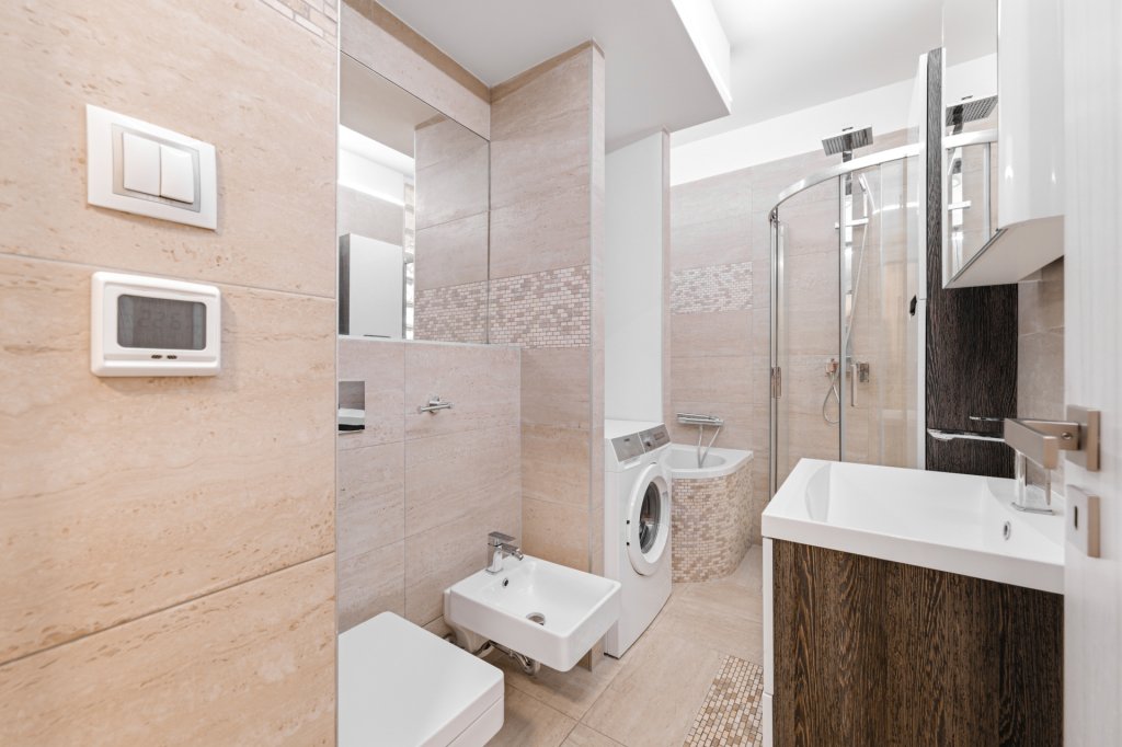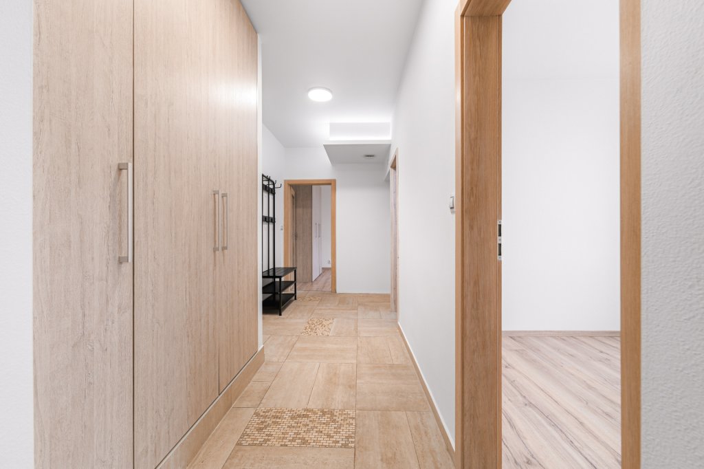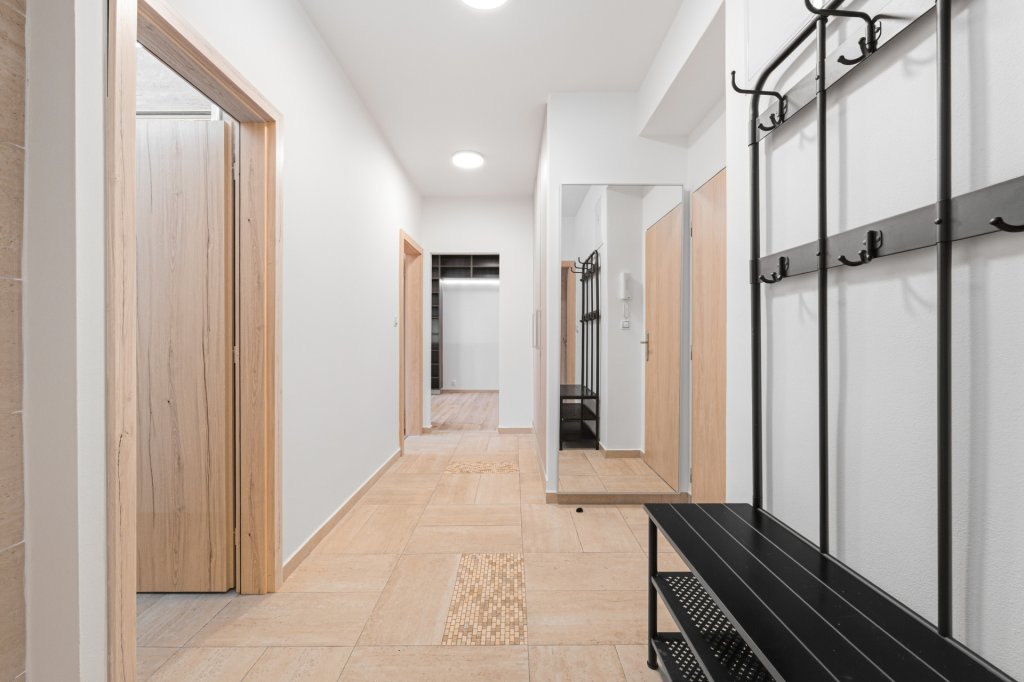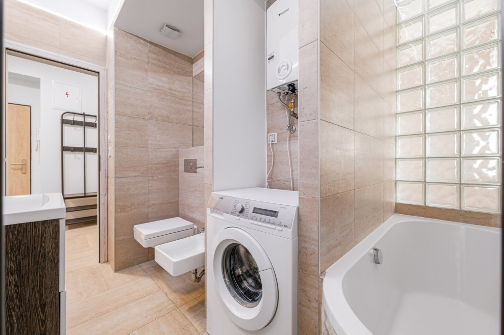 Velkou výhodou je nadstandardně řešená koupelna, kde najdete jak sprchový kout, tak i vanu, dále WC a bidet. V předsíni je navíc připravena instalace pro případné druhé WC – prostor pro vybudování samostatné místnosti je zde dostatečný, což ocení zejména vícečlenná domácnost.